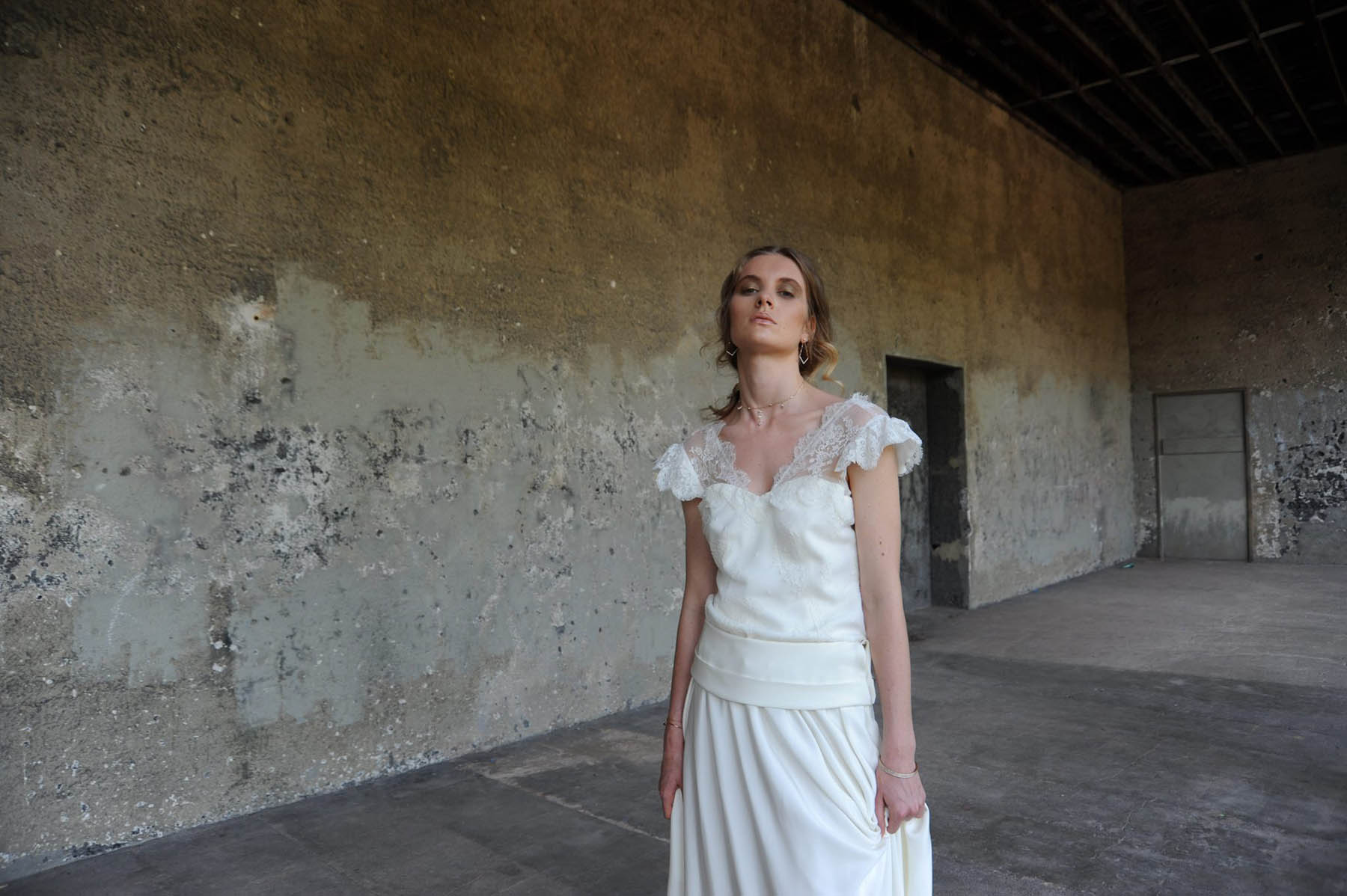 Mélanie est un modèle imaginé pour une cliente qui souhaitait un modèle à la fois sobre et sophistiqué. Cette jupe a été pensé pour mettre en avant le corps féminin. Quant au haut, il s’inscrit dans un esprit lingerie et de légèreté grâce aux jeux de transparence.