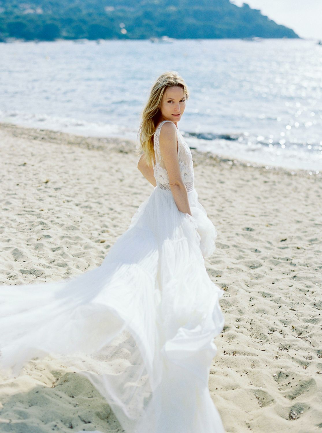 Cette robe illustre le style bohème-chic qu’affectionne particulièrement la créatrice. La longe traine en tulle apporte une touche de divinité à cette magnifique robe.