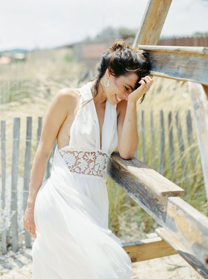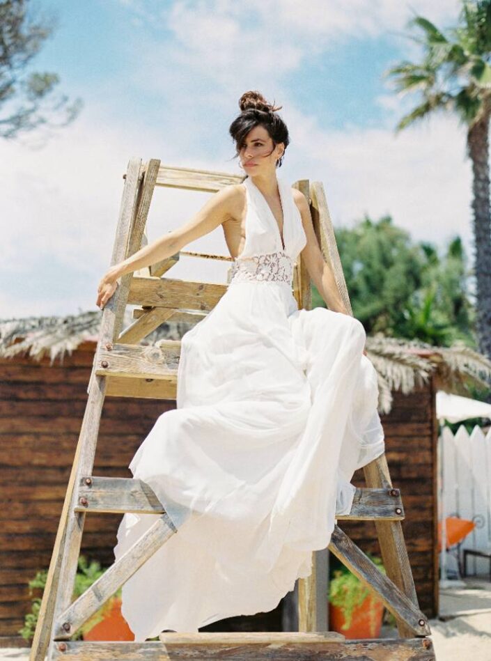 Le splendide drapé de cette robe fluide en mousseline de soie rappelle l’air réconfortant de la mer. Le haut de la robe et la jupe sont liés par une belle dentelle perlée ajourée. Soyez conquise par l’élégance de son décolleté plongeant et de son dos nu.